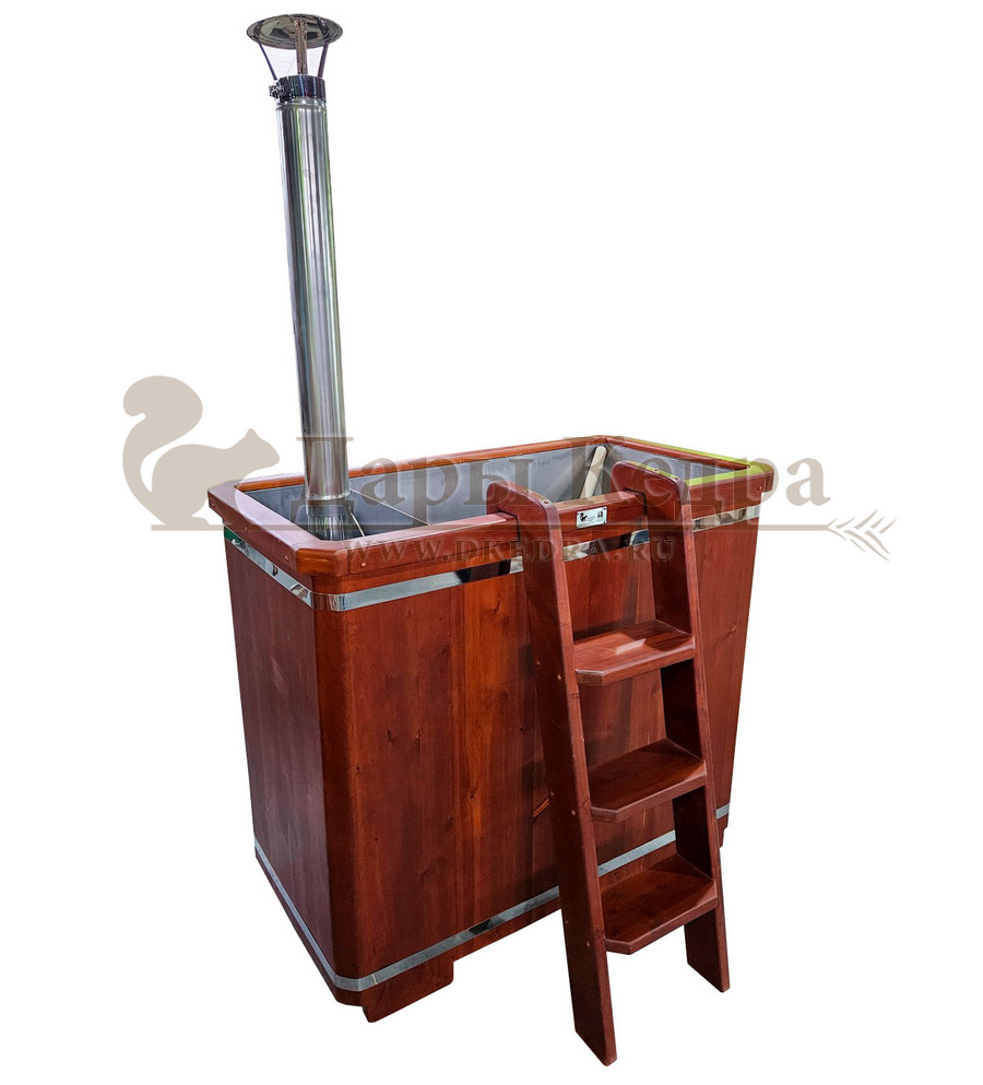 Фурако прямоугольная с металлической вставкой и встроенной печью Фурако со встроенной металлической чашей, печью и внешней отделкой из массива кедра - это уличная баня, которой можно пользоваться круглый год. Купель представляет собой прямоугольную емкость для воды, внутри которой располагается сиденье и трап для ног из кедра. Нагрев воды происходит за счет встроенной печи, которая находится внутри купели за перегородкой. Рекомендуем приобрести термокрышку и весло для перемешивания воды для ускорения нагрева. Для удобства пользования японская баня фурако с металлической вставкой оборудована внешней и внутренней лестницей из кедра.